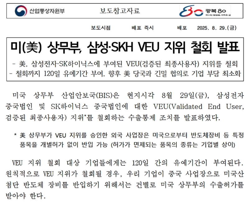 ⇒参照・引用元:『韓国 産業通商資源部』公式サイト「미(美) 상무부, 삼성·SKH VEU 지위 철회 발표」