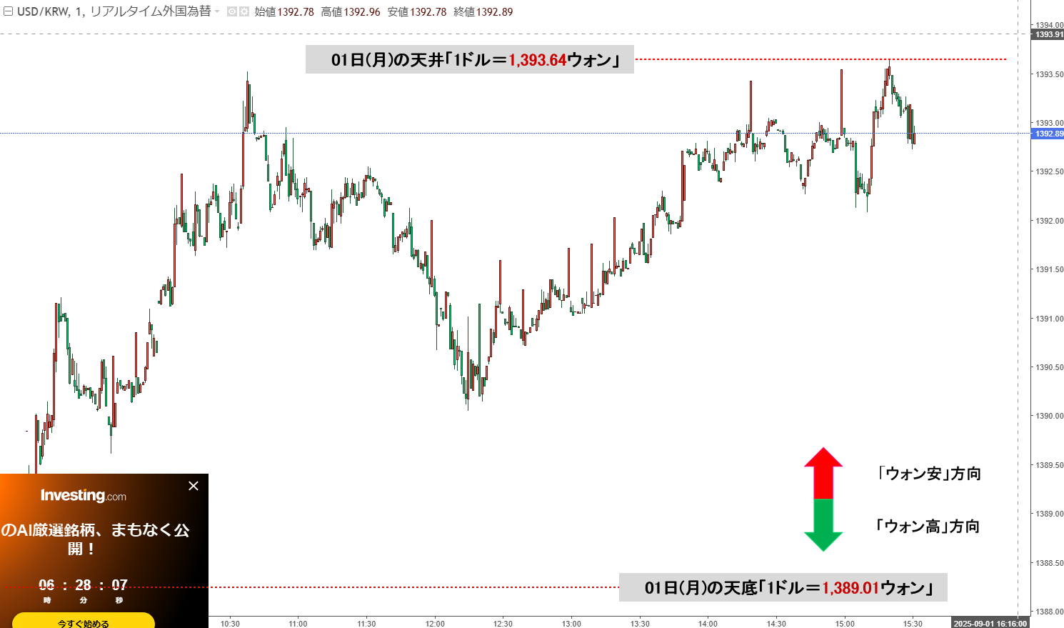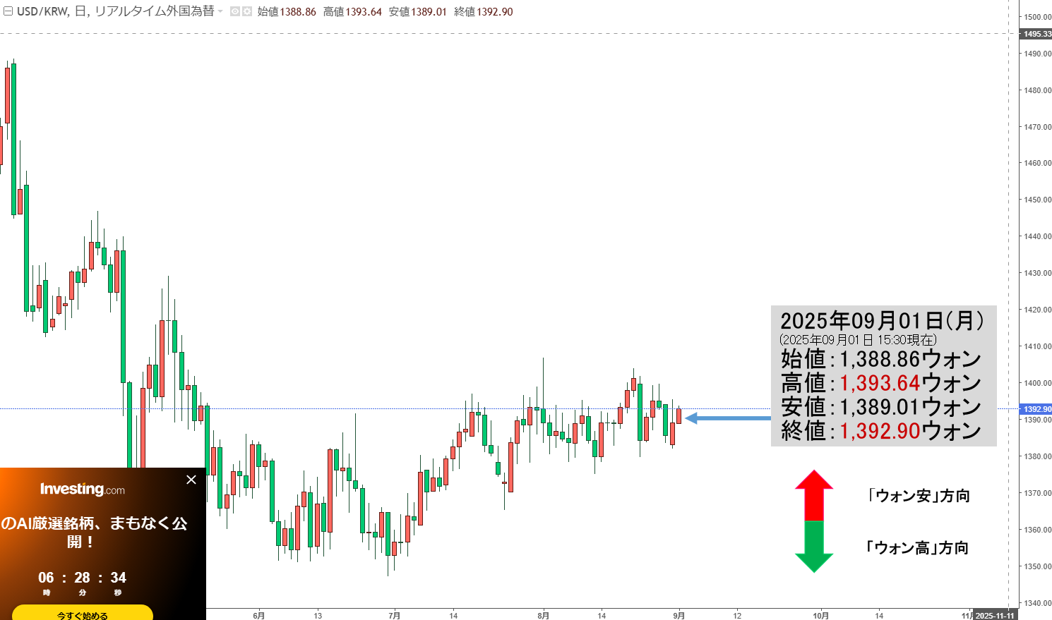 2025年09月02日(火)の市場が開きました。10:00現在、ドルウォンのチャートは以下のようになっています(チャートは『Investing.com』より引用)。前日は陽線で締まり、本日も現在のところ陽線。「1ドル=1,394ウォン」近辺...