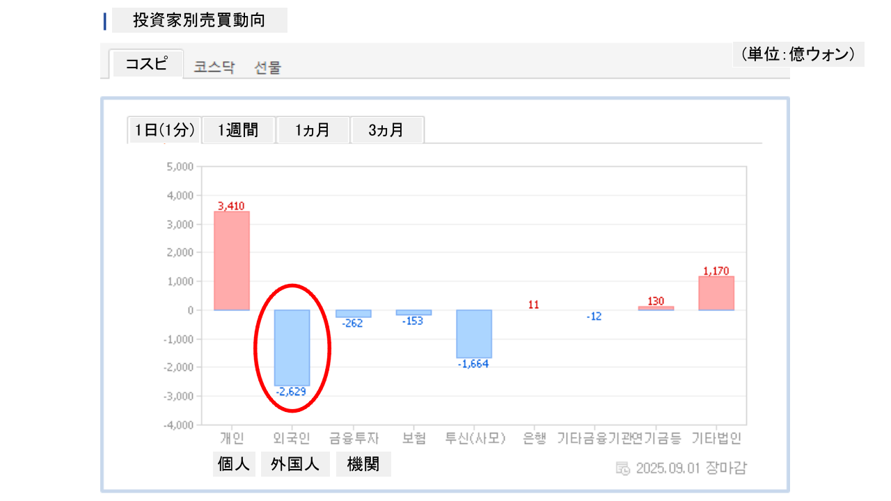 個人投資家は「3,410億ウォン」の買い越し。一方の外国人投資家は「2,629億ウォン」の売り越しです。