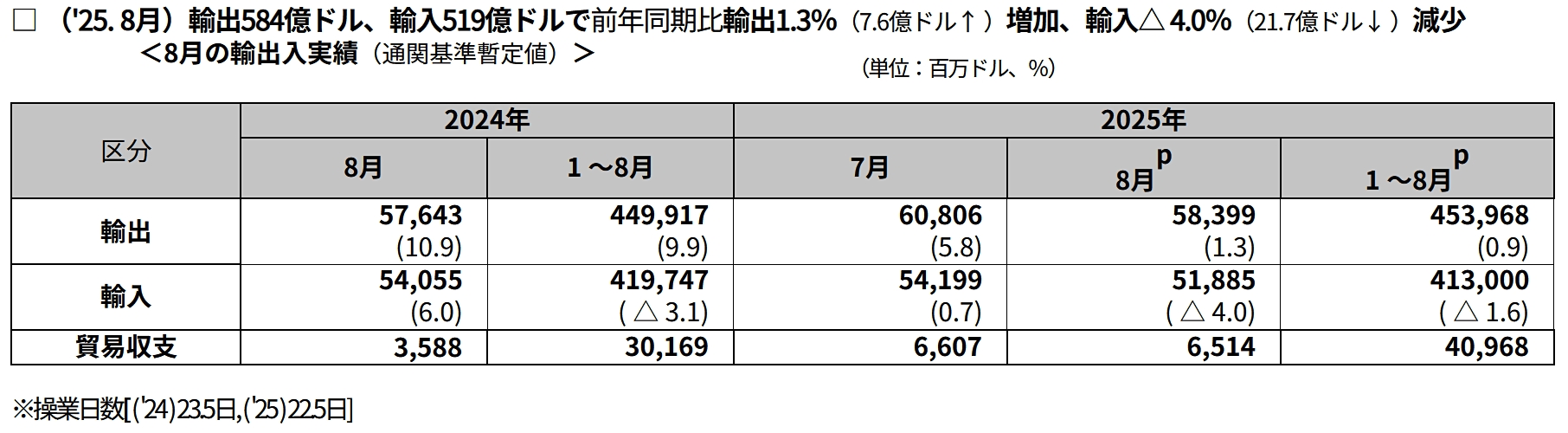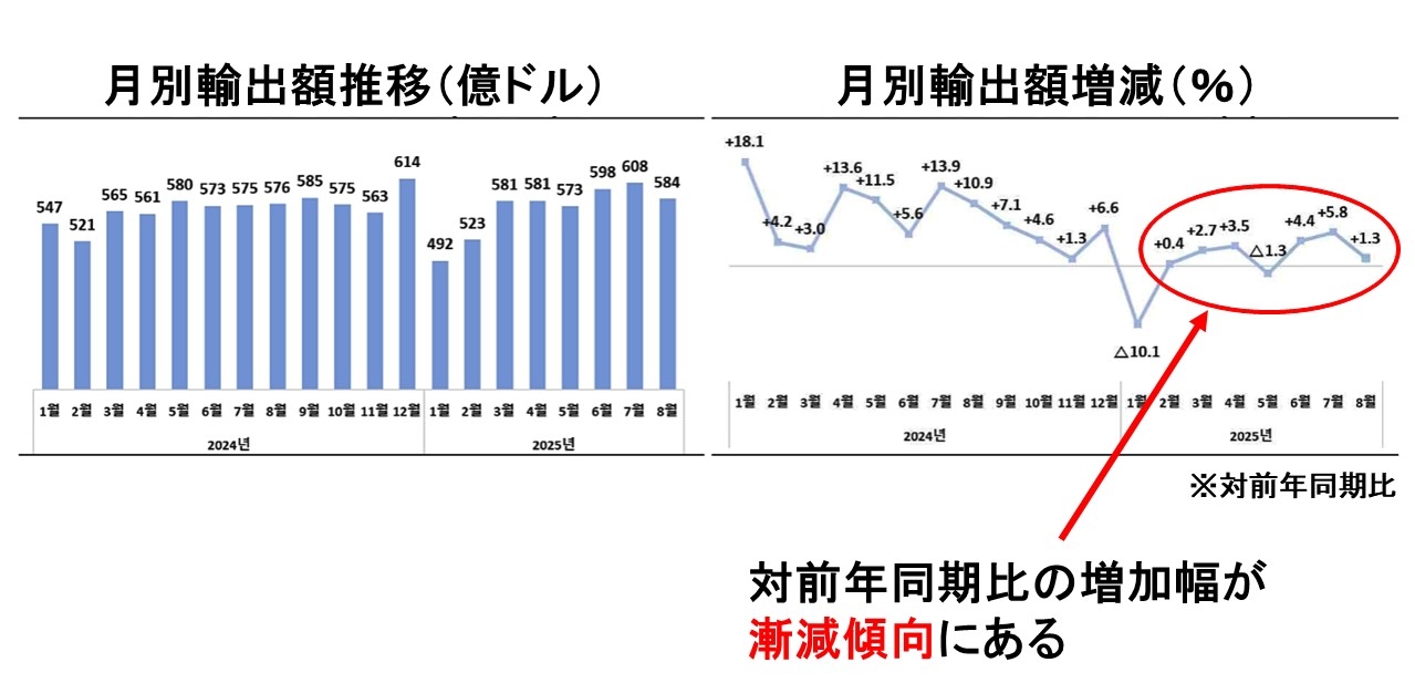 2025年09月1日、韓国の産業通商資源部が「08月の輸出入動向」のデータを公表しました。