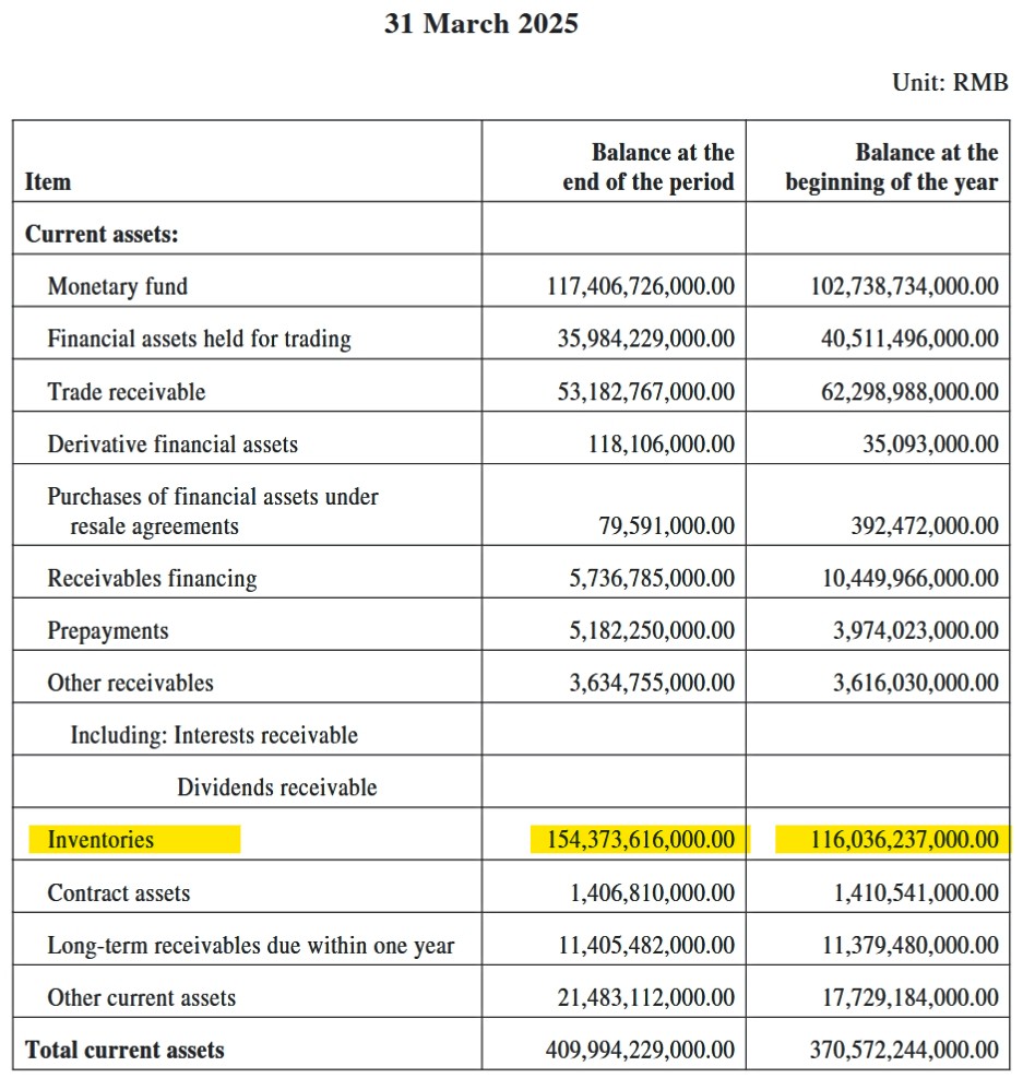 まず、2025年第1四半期のデータ。在庫は「Inventories/存貨」の項目に表示されています。