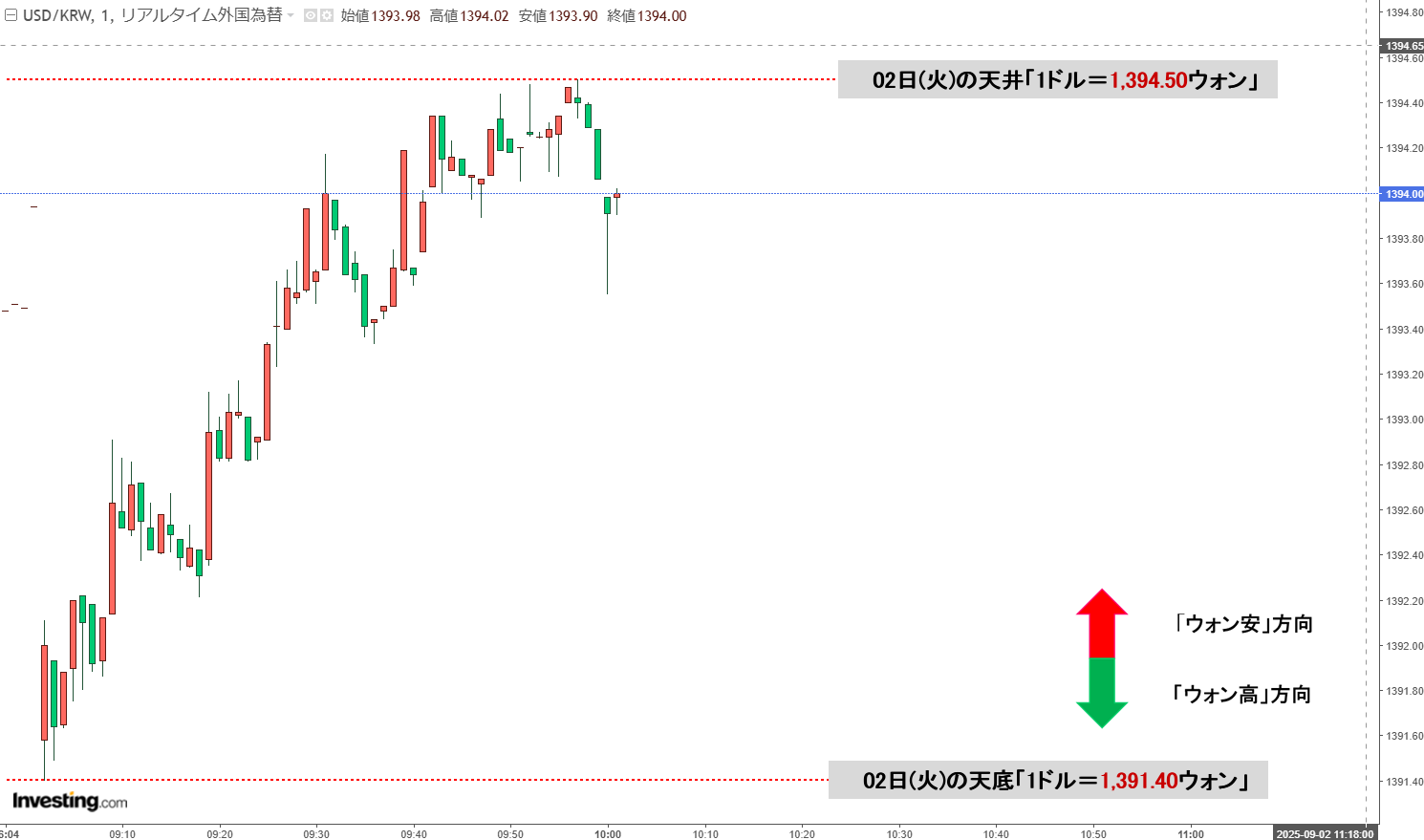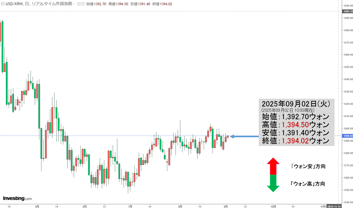 2025年09月02日(火)の市場が開きました。10:00現在、ドルウォンのチャートは以下のようになっています(チャートは『Investing.com』より引用)。