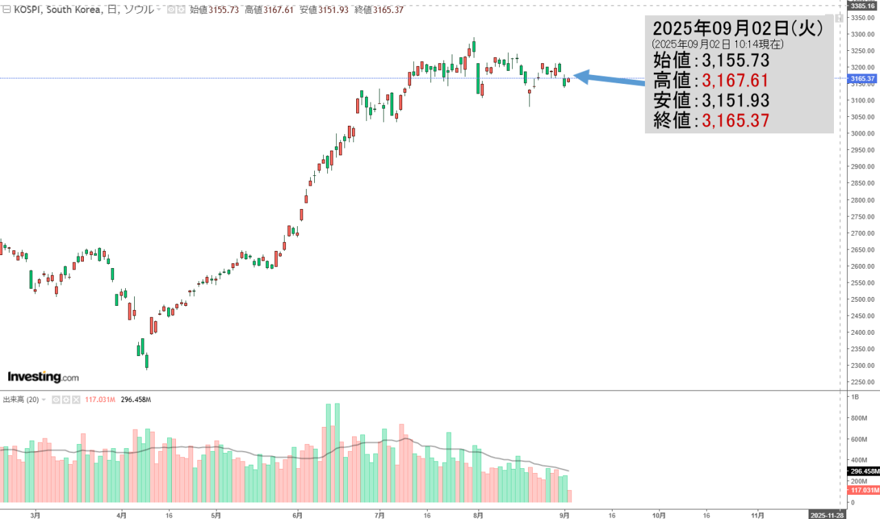 2025年09月02日(火)の韓国株式市場が締まりました。15:38現在、KOSPI(韓国総合株価指数)のチャートは以下のようになっています(チャートは『Investing.com』より引用)。陽線で終了しました。KOSPIは「3,172」...