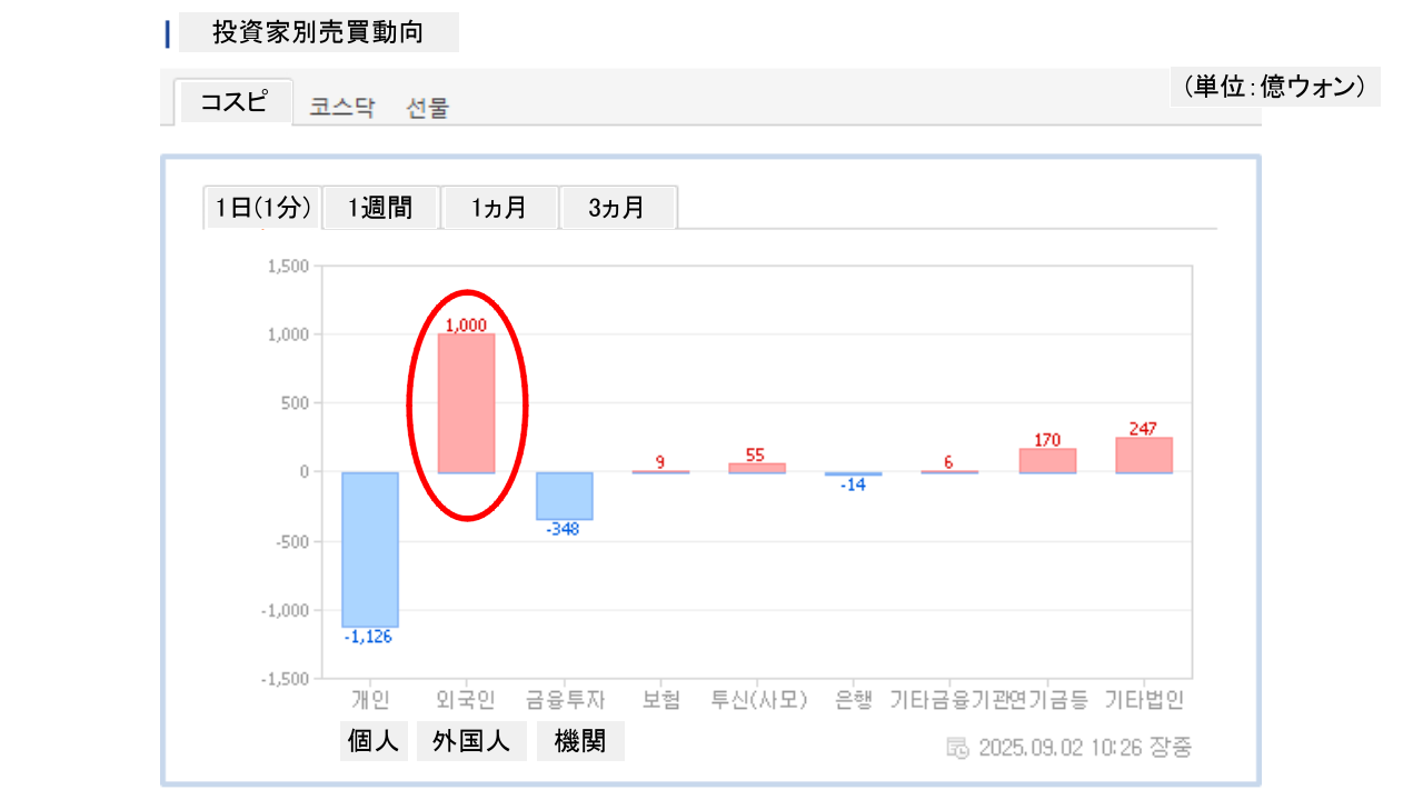 個人投資家は「1,126億ウォン」の売り越し。一方の外国人投資家は「1,000億ウォン」の買い越しです。