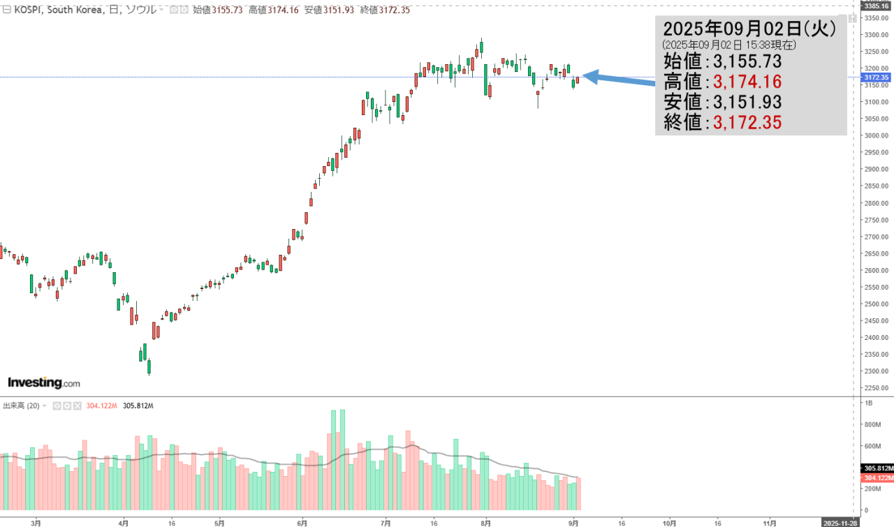 2025年09月02日(火)の韓国株式市場が締まりました。15:38現在、KOSPI(韓国総合株価指数)のチャートは以下のようになっています(チャートは『Investing.com』より引用)。