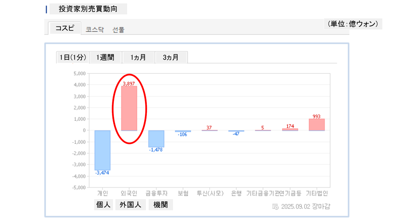 個人投資家は「3,474億ウォン」の売り越し。一方の外国人投資家は「3,897億ウォン」の買い越しです。