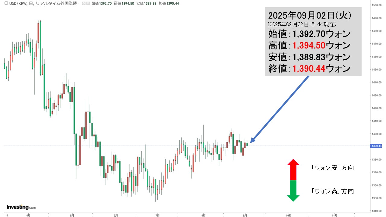 2025年09月02日(火)15:44現在、ドルウォンのチャートは以下のようになっています(チャートは『Investing.com』より引用)。