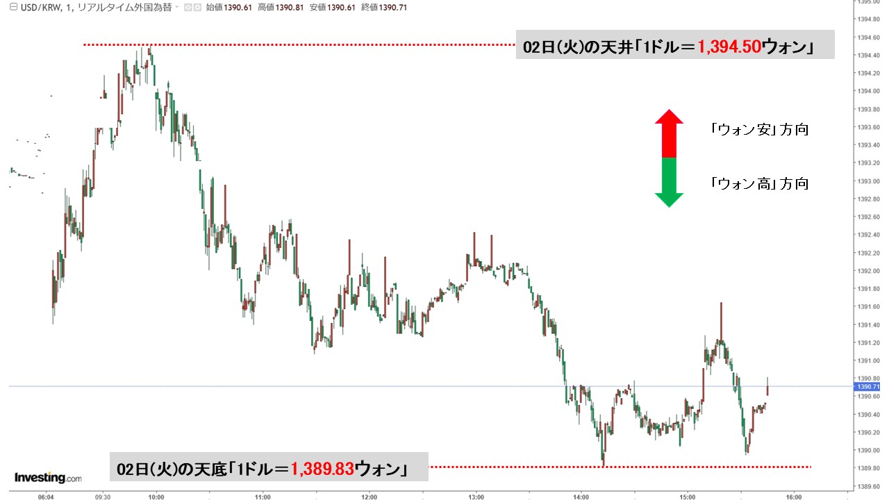 「ドルウォン」02日(火)夕刻・「1,390ウォン」陰線伸びて……。