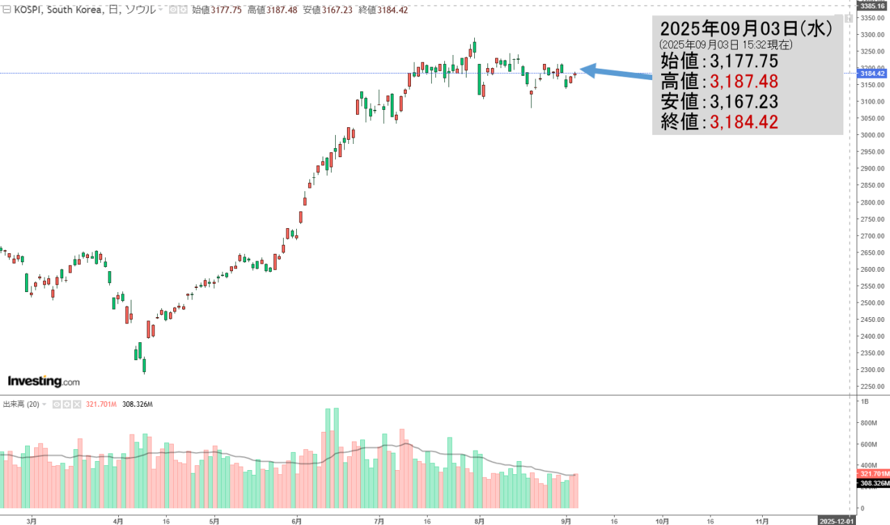 「韓国株式市場」09月04日(木)初動・KOSPI「3,203」