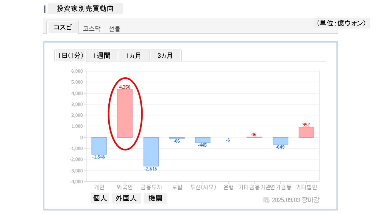 個人投資家は「1,546億ウォン」の売り越し。一方の外国人投資家は「4,350億ウォン」の買い越しです。