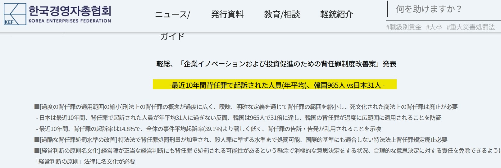 最近10年間、背任罪で起訴された人数(年間平均)、韓国965人 vs 日本31人 –