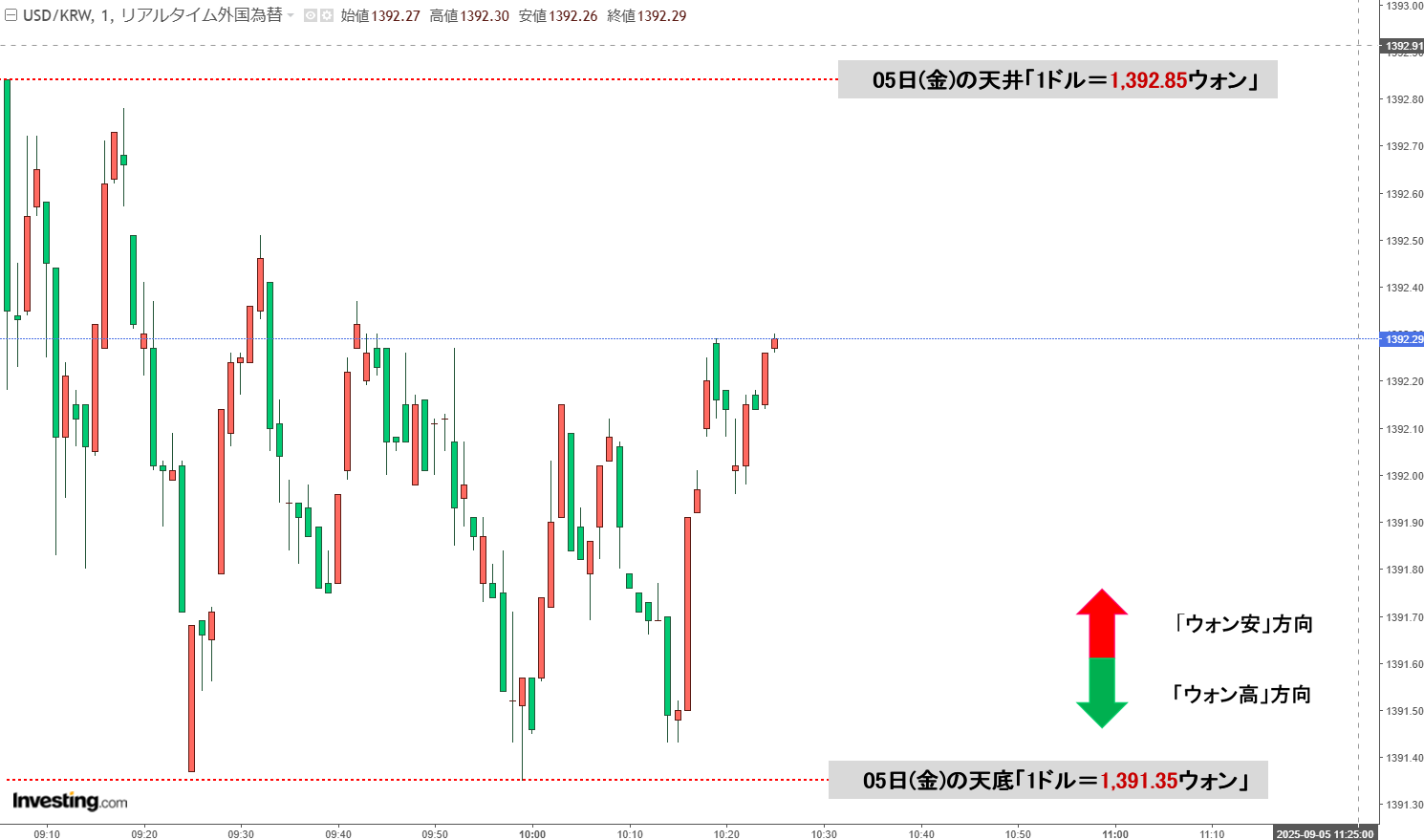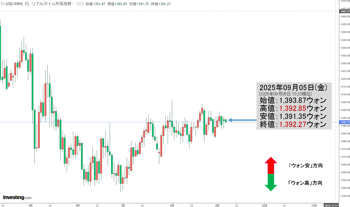 2025年09月05日(金)の市場が開きました。10:23現在、ドルウォンのチャートは以下のようになっています(チャートは『Investing.com』より引用)。