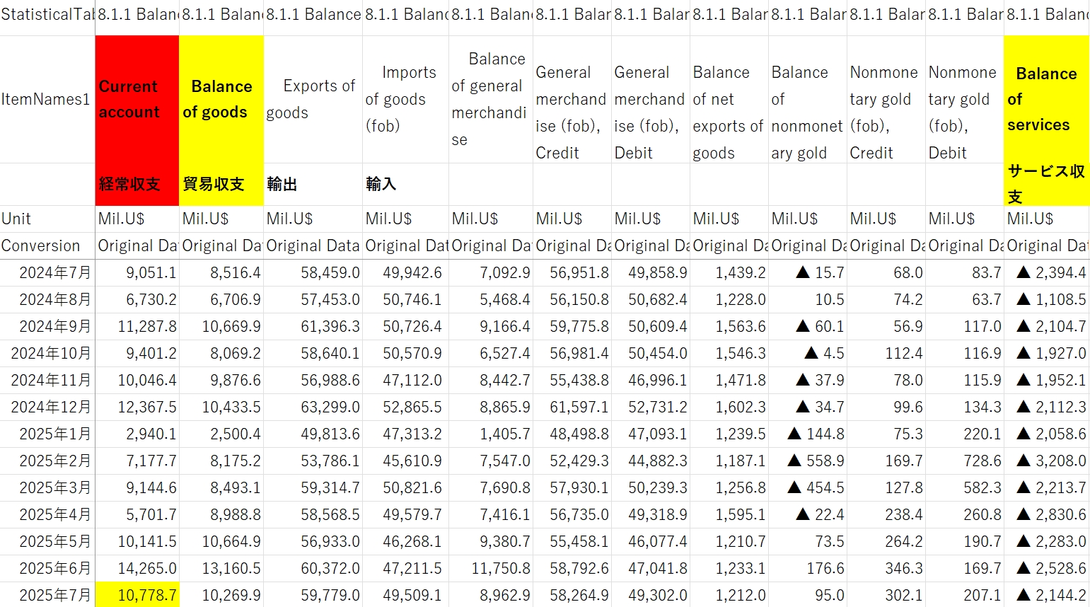 ↑黄色の蛍光ペンでフォーカスしているのが2025年07月の経常収支。2025年07月