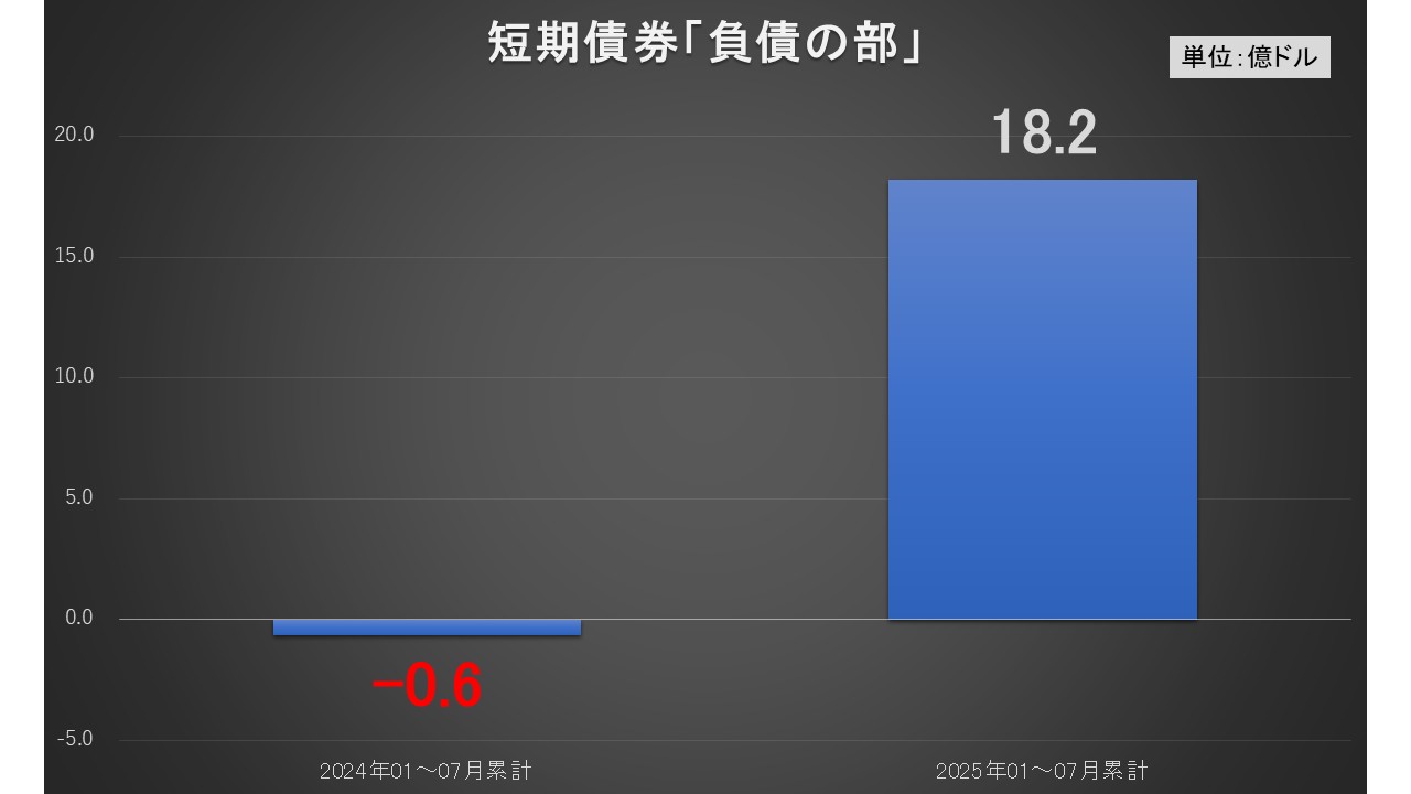 2025年01~07月累計は「約18.2億ドル」です。2024年の同期は「約-0.6億ドル」でしたので、韓国政府は短期債券でも負債を積み上げていることが分かります。