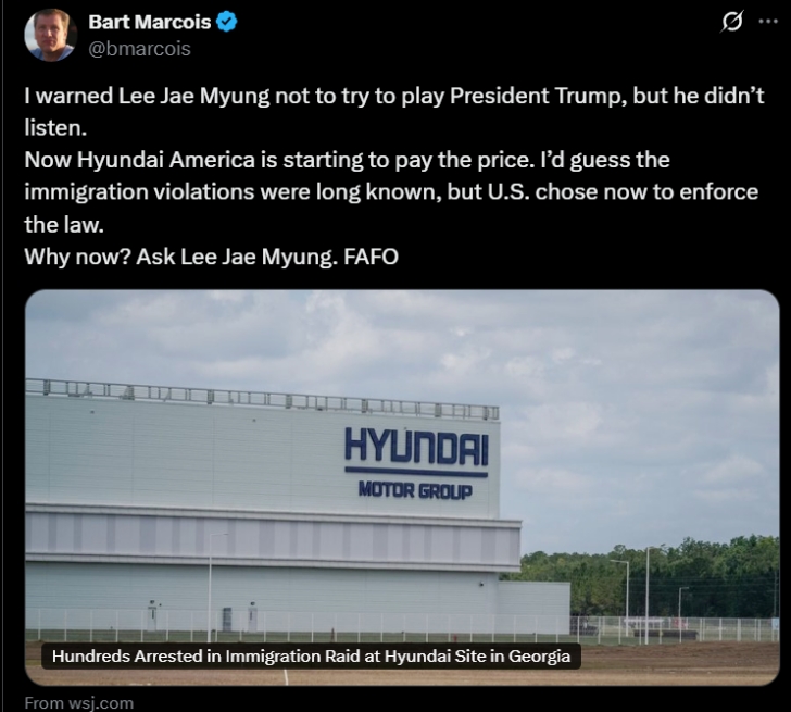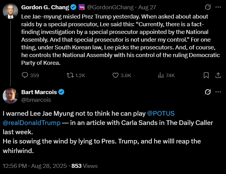 私は李在明に対し、@POTUS(アメリカ大統領)、@realDonaldTrump を翻弄できるなどと思うなと警告した――先週、カーラ・サンズとの連名で The Daily Caller に掲載した記事の中で。彼はトランプ大統領に嘘をつくことで「風を蒔いて」おり、その結果「嵐を刈り取る」ことになるだろう。