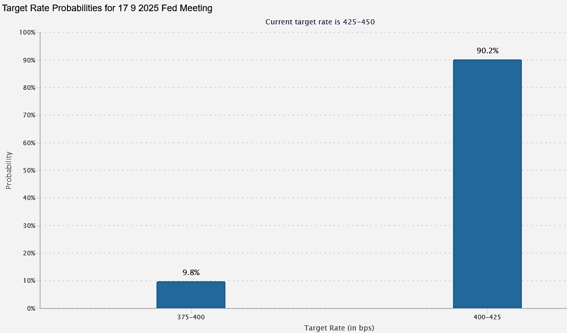 ↑『CME』の「FedWatch」を確認すると、次回の『FOMC』(2025年09月16日〜17日)で「4.00~4.25%」になる確率は「90.2%」となっています(ビッグカットの可能性は9.8%/2025年09月08日時点)。