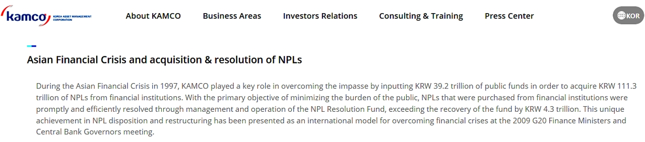 さらにちなみに、韓国の『KAMCO』は1997年のアジア通貨危機時(韓国側呼称は「IMF危機」)には不良債権処理で中心的な役割を担いました。