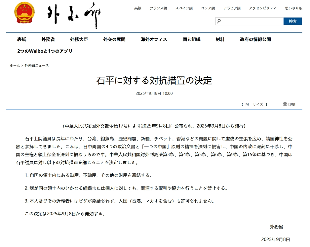 2025年09月08日、中国外交部は、日本人であり参議院議員である石平さんに対して「反制措置を行う」という決定を下しました。