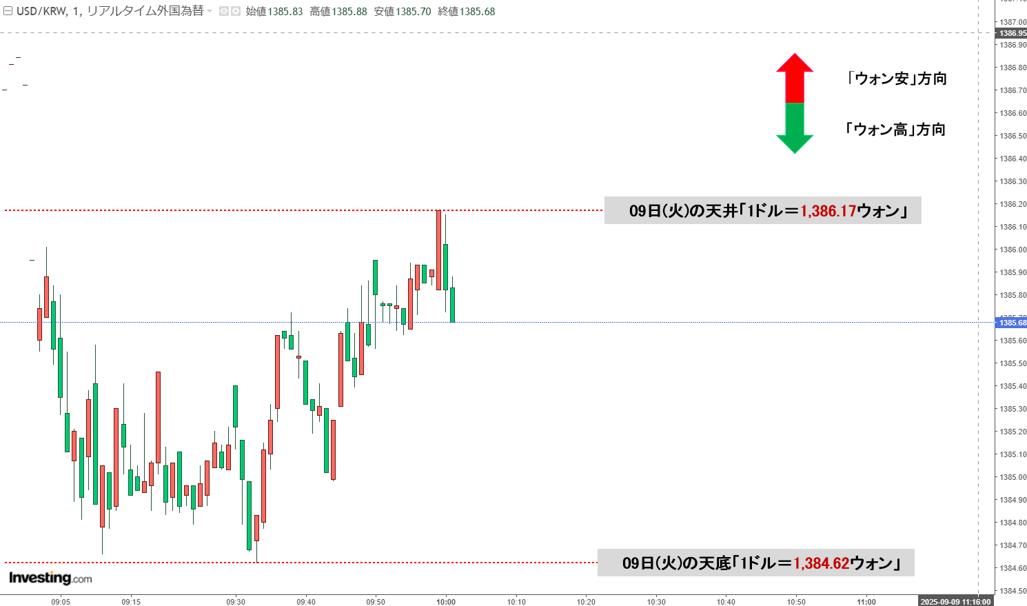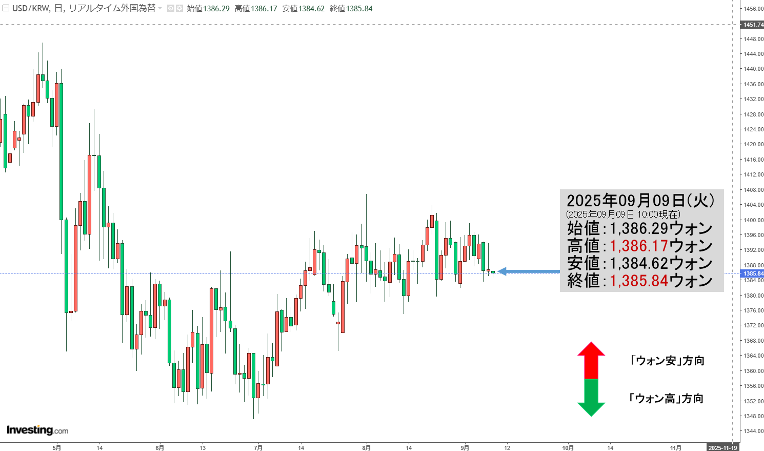 2025年09月09日(火)の市場が開きました。10:00現在、ドルウォンのチャートは以下のようになっています(チャートは『Investing.com』より引用)。