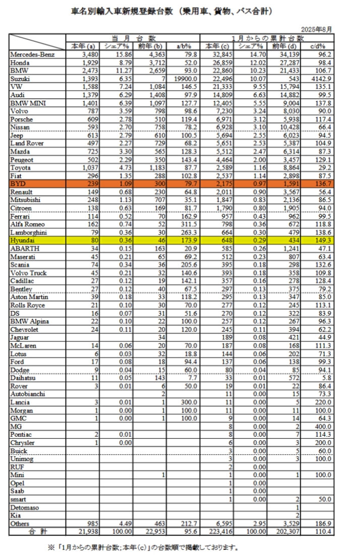 2025年09月04日、『日本自動車輸入組合』が「輸入車新規登録台数(速報) 」を公表しました。『現代自動車』は日本国内に生産拠点を持ちませんので、日本でどのくらい売れたのかはこの新規登録台数に捉えられているはずです。