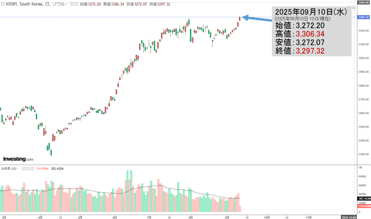 「韓国株式市場」09月10日(水)初動・KOSPI「3,297」ギャップアップ!