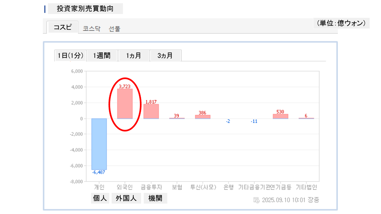 個人投資家は「6,487億ウォン」の売り越し。一方の外国人投資家は「3,723億ウォン」の買い越しです。