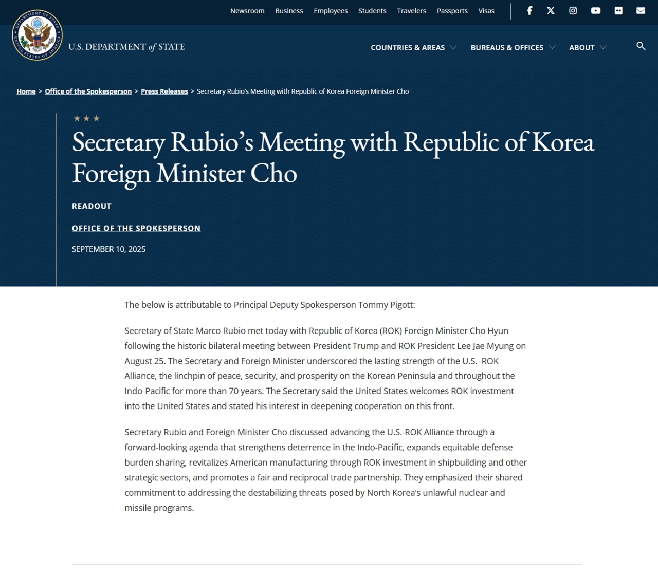 2025年09月11日午前09時30分、急きょ訪米した韓国の趙顕(チョ・ヒョン)外交部部長(長官:外相に相当)とアメリカ合衆国のマルコ・ルビオ国務長官との会談が行われました。