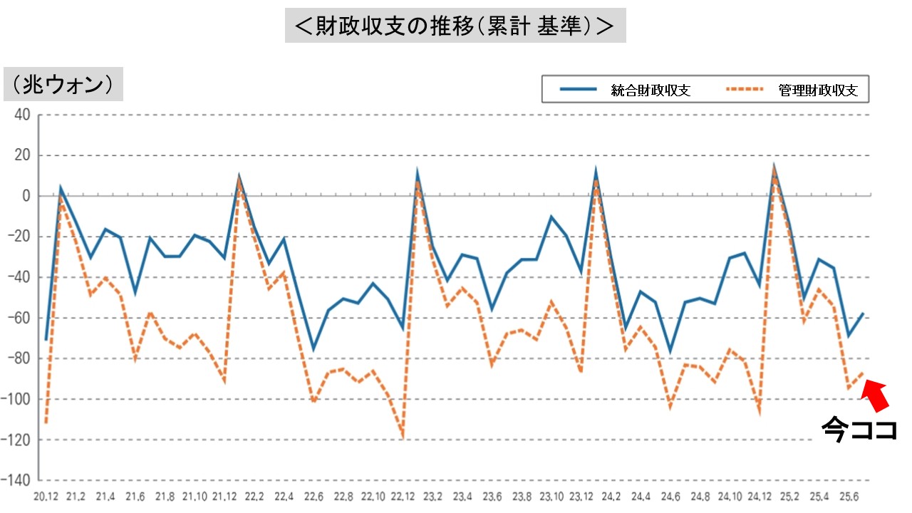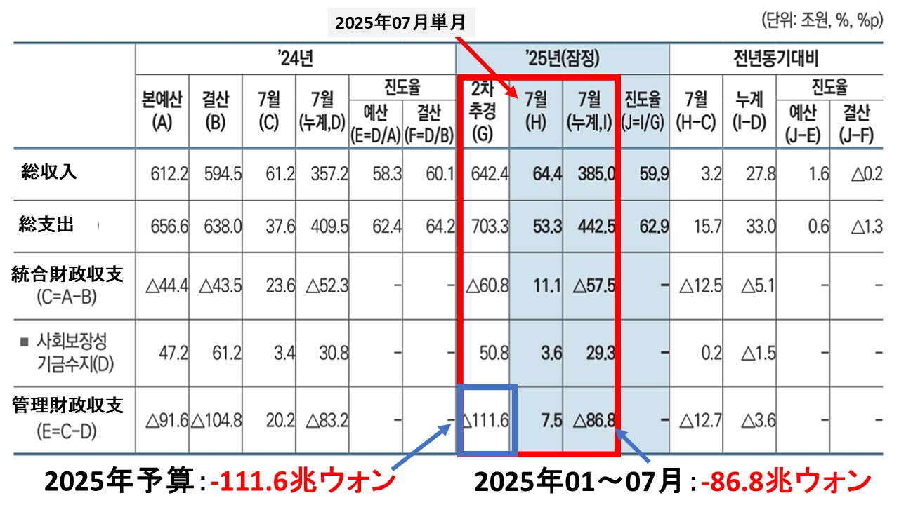 2025年01~06月累計で管理財政収支は「-94.3兆ウォン」だったのですが、01~07月累計では「-86.8兆ウォン」で赤字は小さくなりました。