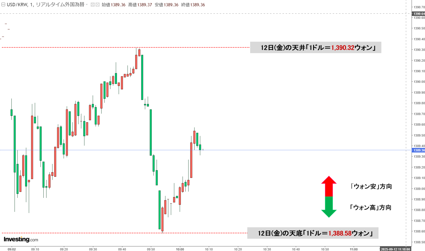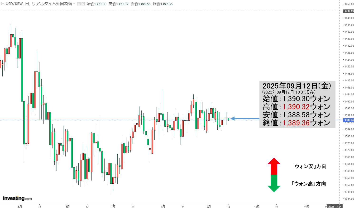 2025年09月12日(金)の韓国時間※が終わりました。15:30現在、ドルウォンのチャートは以下のようになっています(チャートは『Investing.com』より引用)。現在のところ「1ドル=1,388ウォン」近辺の攻防となっています。ロ…