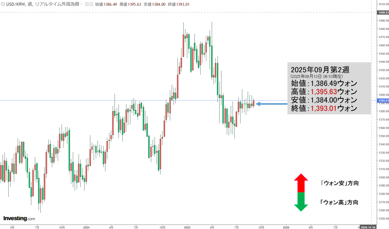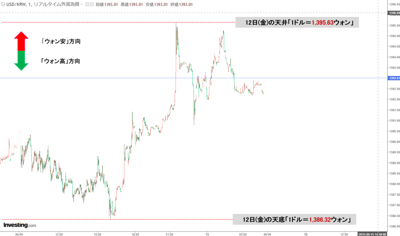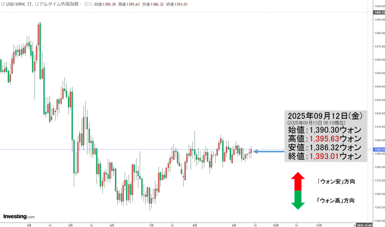 2025年09月15日(月)の市場が開きました。10:00現在、ドルウォンのチャートは以下のようになっています(チャートは『Investing.com』より引用)。現在のところ「1ドル=1,390ウォン」近辺の攻防となっています。ローソク足…