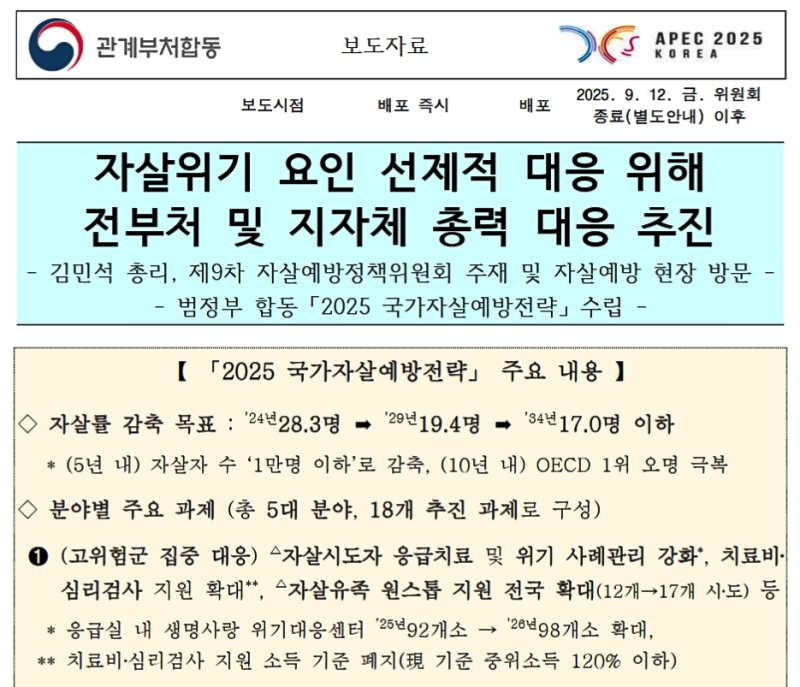 2025年09月12日、韓国の保健福祉部が「2025 国家自殺予防戦略」を関係省庁と共同で公表しました(以下はプレスリリース)。
