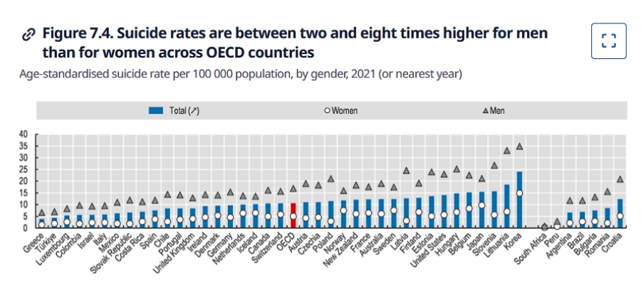 『OECD』(Organisation for Economic Co-operation and Developmentの略:経済協力開発機構)の『Society at a Glance 2024』“Suicides”セクションでも、韓国の自殺率の数字は際立っています。
