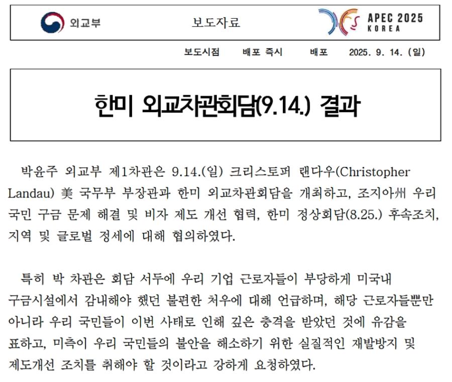 とりわけ朴潤柱(パク・ユンジュ)次官は、会談の冒頭で、わが企業の勤労者が不当に合衆国内の拘束施設で甘受せざるを得なかった不便な処遇について言及し、当該勤労者らのみならず、わが国民が今回の事態により深い衝撃を受けたことに遺憾を表し、合衆国側がわが国民の不安を解消するための実質的な再発防止および制度改善措置を取らねばならないと強く要請した。