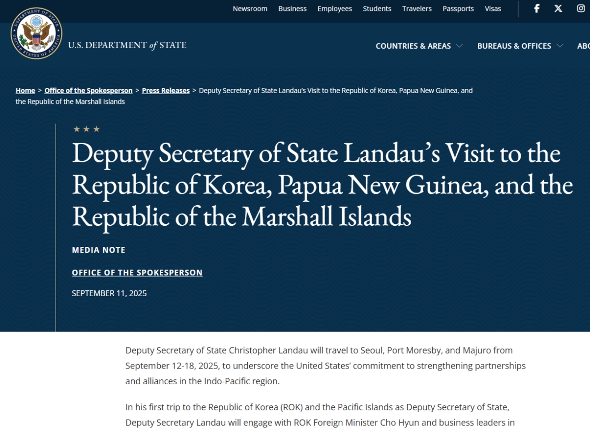 クリストファー・ランダウ国務次官は、2025年09月12日から18日まで、ソウル、ポートモレスビー、マジュロを訪問し、インド太平洋地域におけるパートナーシップと同盟関係の強化に対する合衆国の取り組みを強調する予定です。