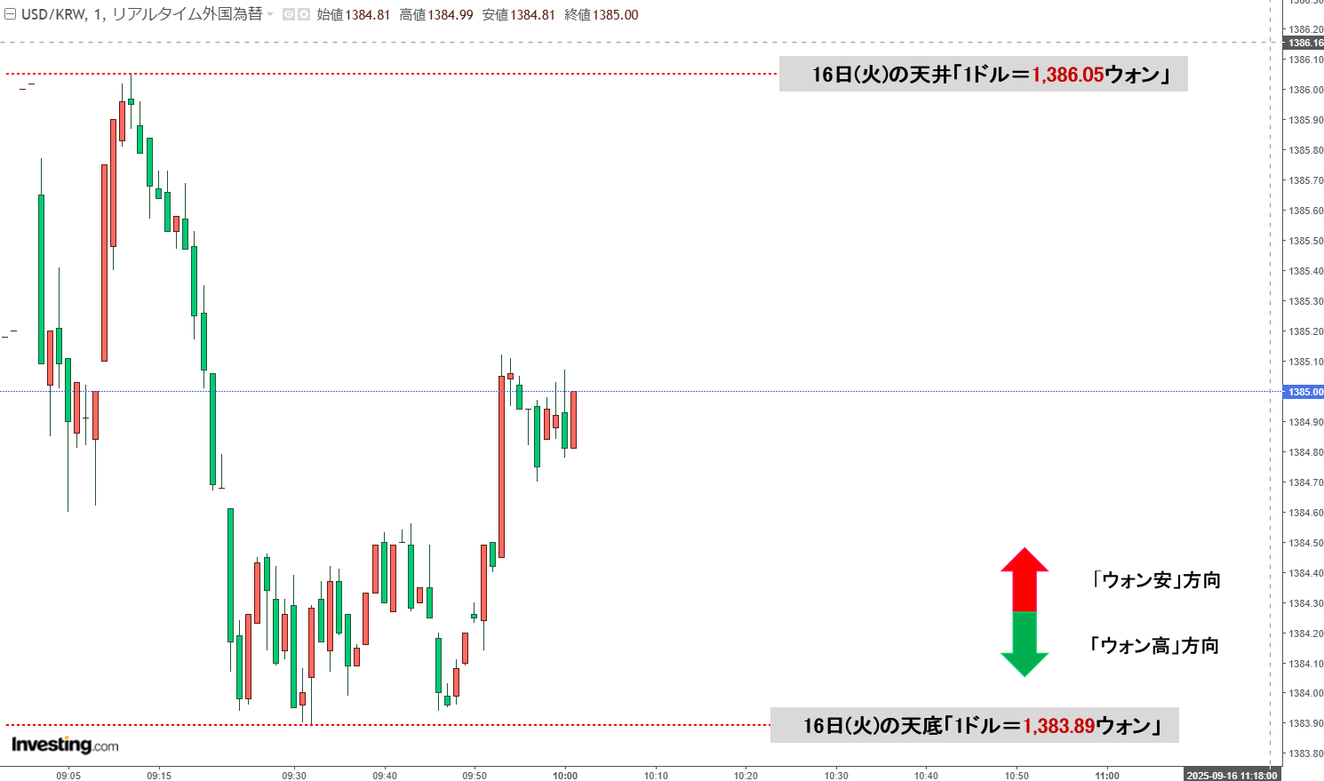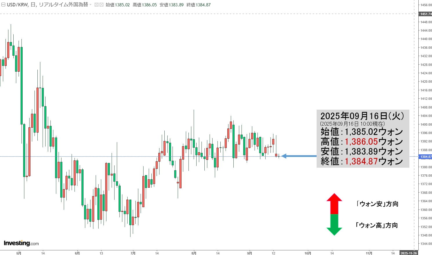2025年09月16日(火)の市場が開きました。10:00現在、ドルウォンのチャートは以下のようになっています(チャートは『Investing.com』より引用)。
