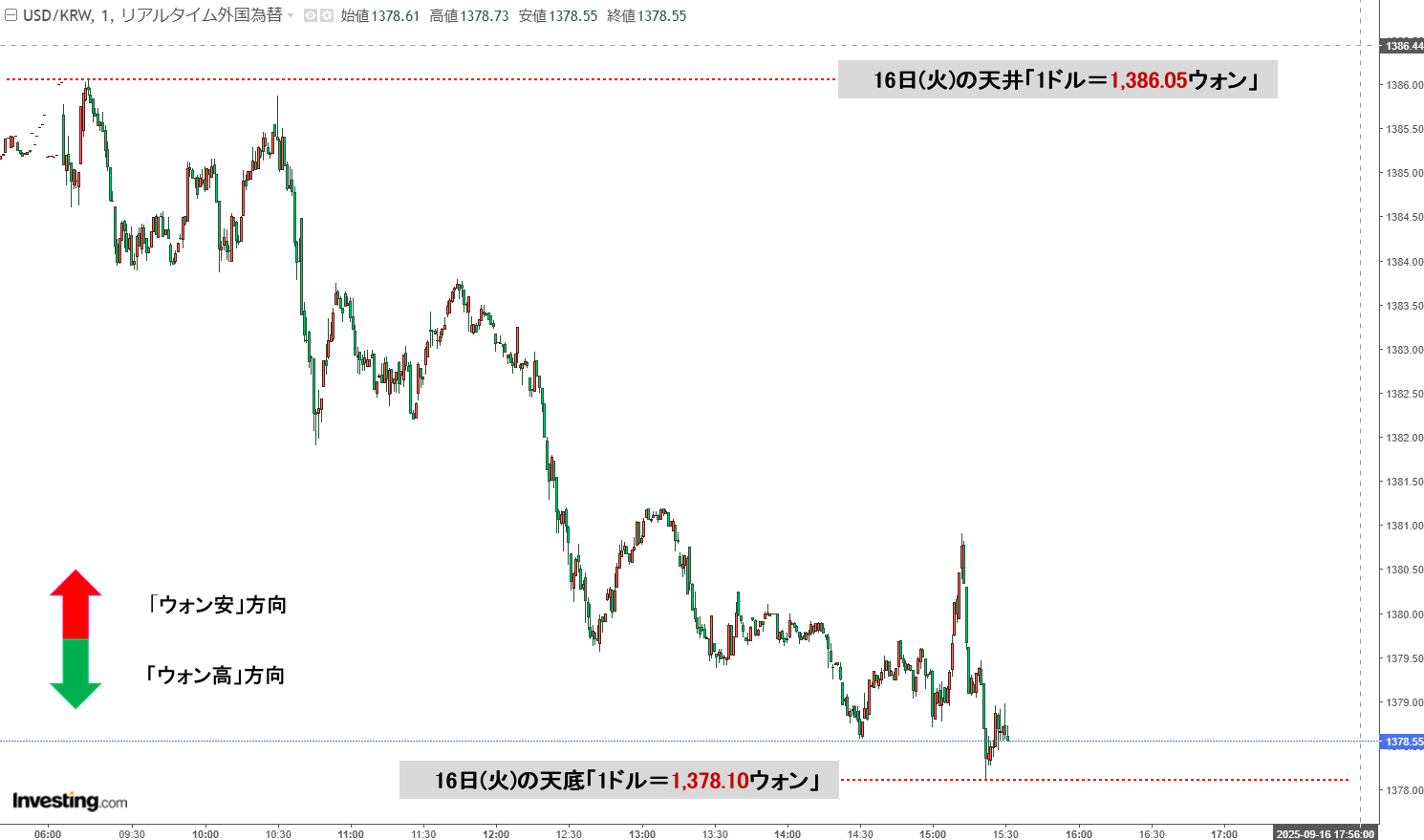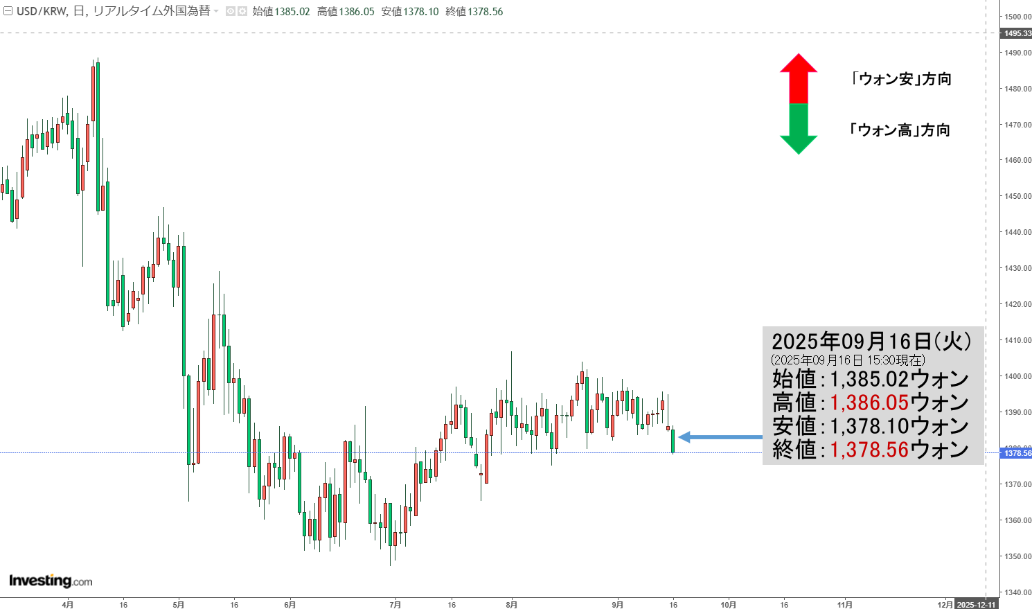 2025年09月16日(火)15:30現在、ドルウォンのチャートは以下のようになっています(チャートは『Investing.com』より引用)。