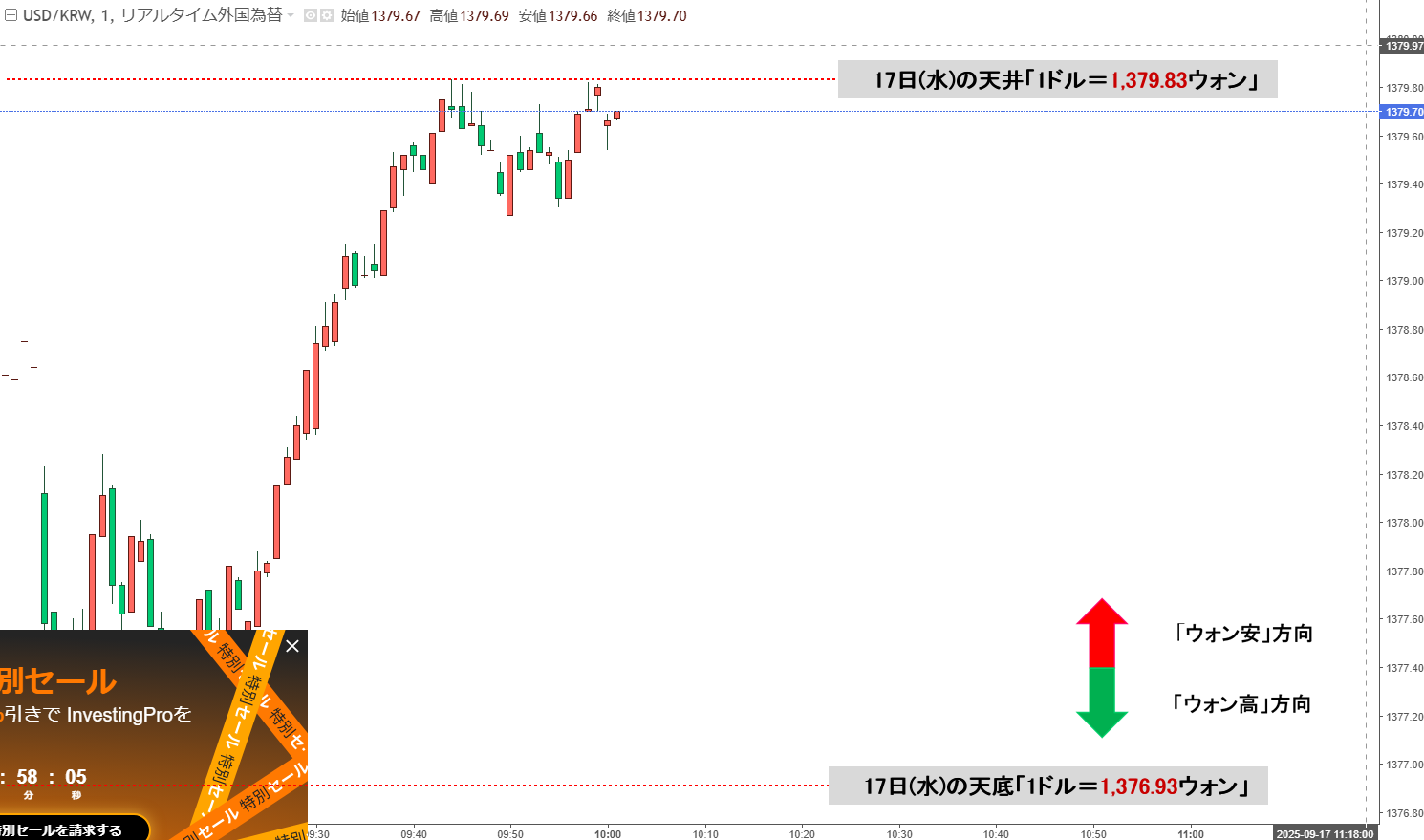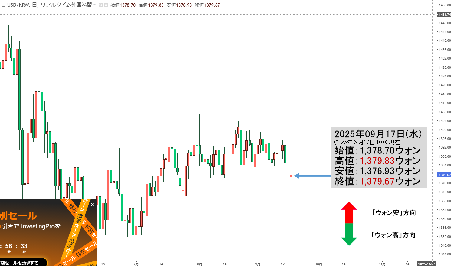 2025年09月17日(水)の市場が開きました。10:00現在、ドルウォンのチャートは以下のようになっています(チャートは『Investing.com』より引用)。