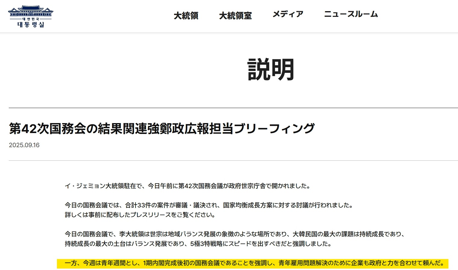 (後略)⇒参照・引用元:『TV朝鮮』「李대통령 “청년 고용 문제, 기업도 동참해달라”…대통령실 “22일 청년종합대책 발표 예정”」
