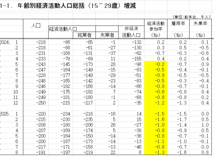 黄色のマーカーの部分にご注目いただきたいのですが、15~29歳で経済活動に参加している率が、2025年08月時点で、16カ月も連続で減少しているのです。