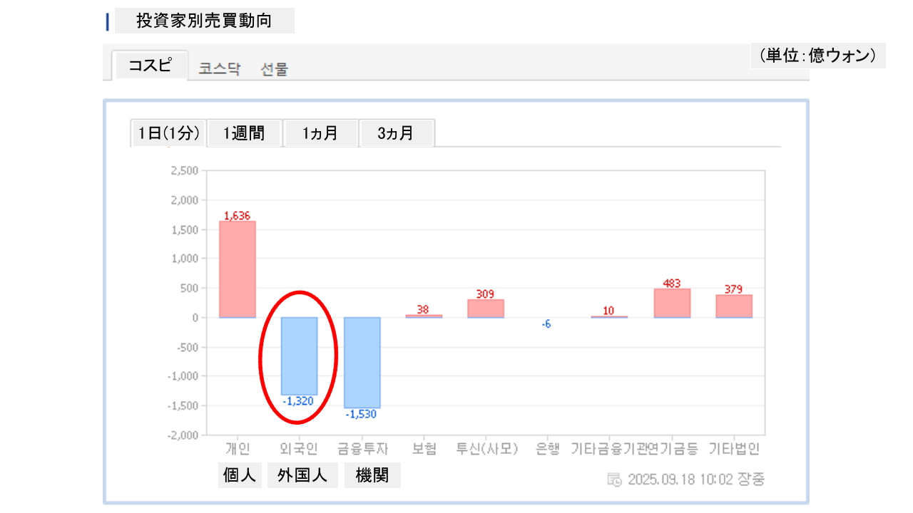 個人投資家は「1,636億ウォン」の買い越し。一方の外国人投資家は「1,320億ウォン」の売り越しです。