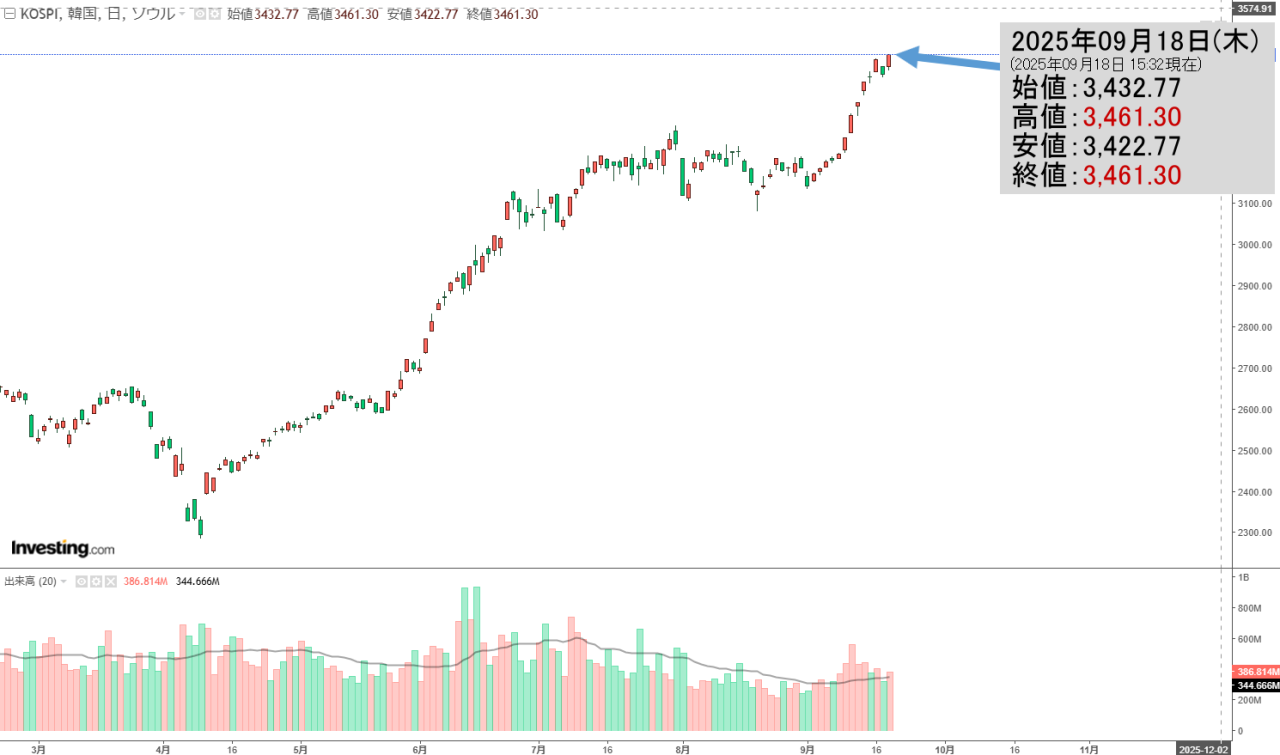 「韓国株式市場」09月19日(金)初動・KOSPI「3,442」