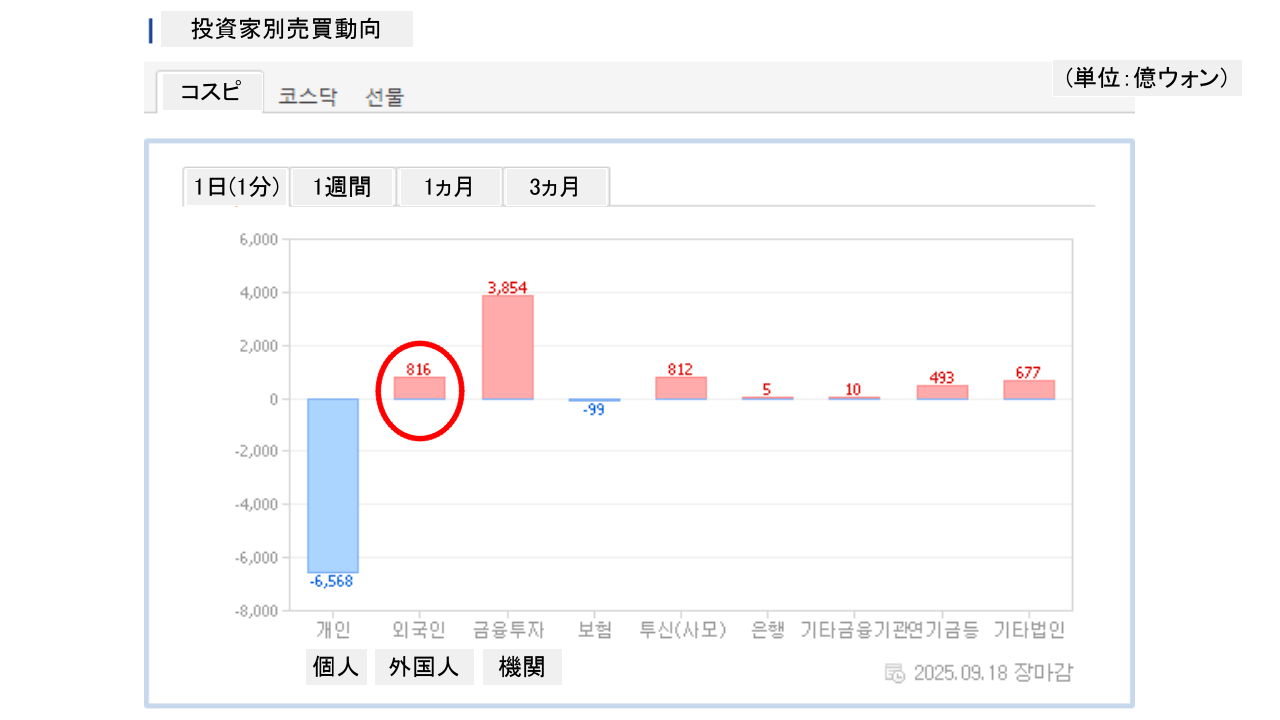 個人投資家は「6,568億ウォン」の売り越し。一方の外国人投資家は「816億ウォン」の買い越しです。
