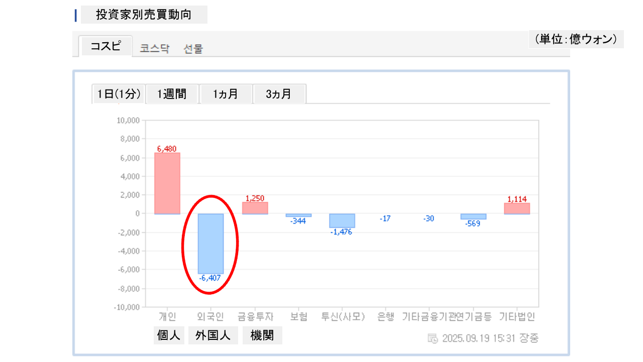 個人投資家は「6,480億ウォン」の買い越し。一方の外国人投資家は「6,407億ウォン」の売り越しです。