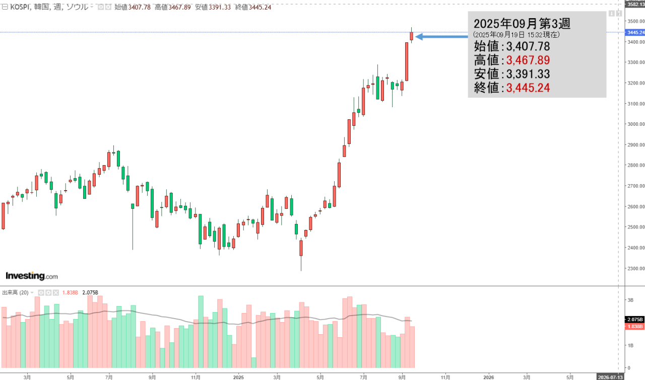 2025年09月22日(月)の韓国株式市場が開きましたので、KOSPIチャートの初動状況を以下の記事にまとめました。本記事と併せてお読み頂ければ幸いです。