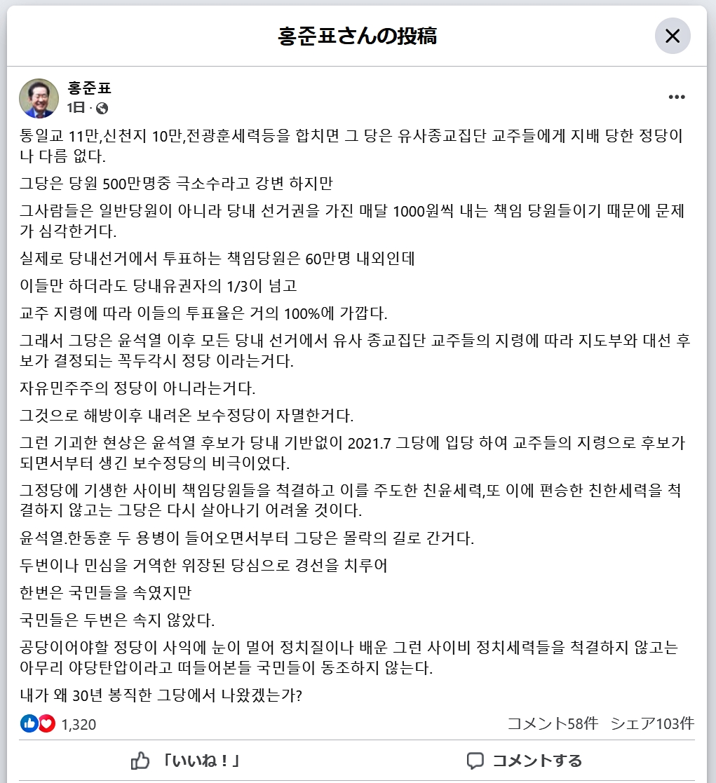 洪準杓(ホン・ジュンピョ)さんは、当員名簿と宗教団体名簿の照合をめぐる報道を直接参照しながら、『国民の力』は、もはや「似非宗教集団の教主に支配された政党だ」――と批判しています。