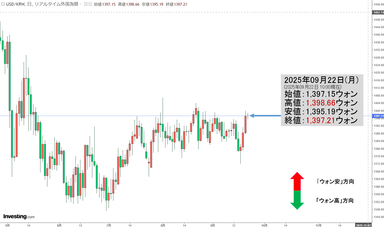 2025年09月22日(月)の市場が開きました。10:00現在、ドルウォンのチャートは以下のようになっています(チャートは『Investing.com』より引用)。