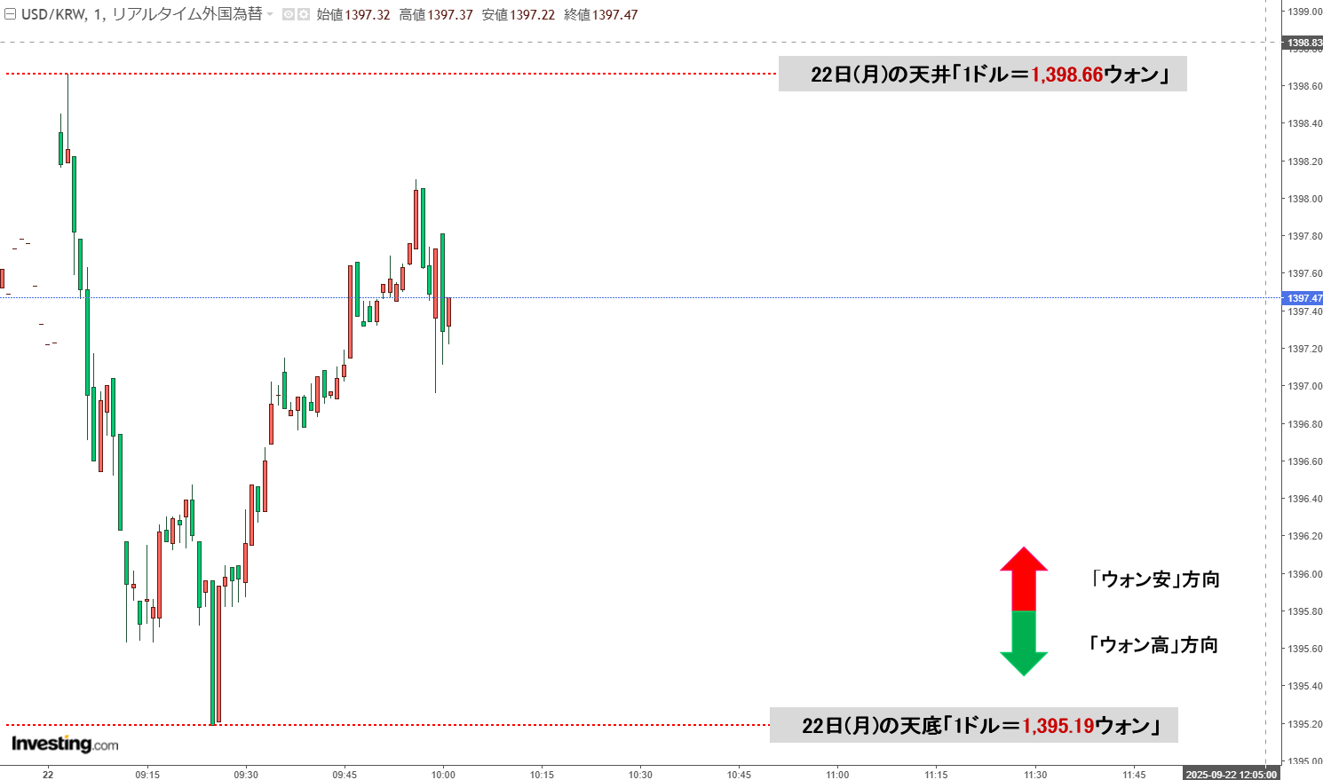 「ドルウォン」09月22日(月)初動・「1,397ウォン」レンジっぽく……