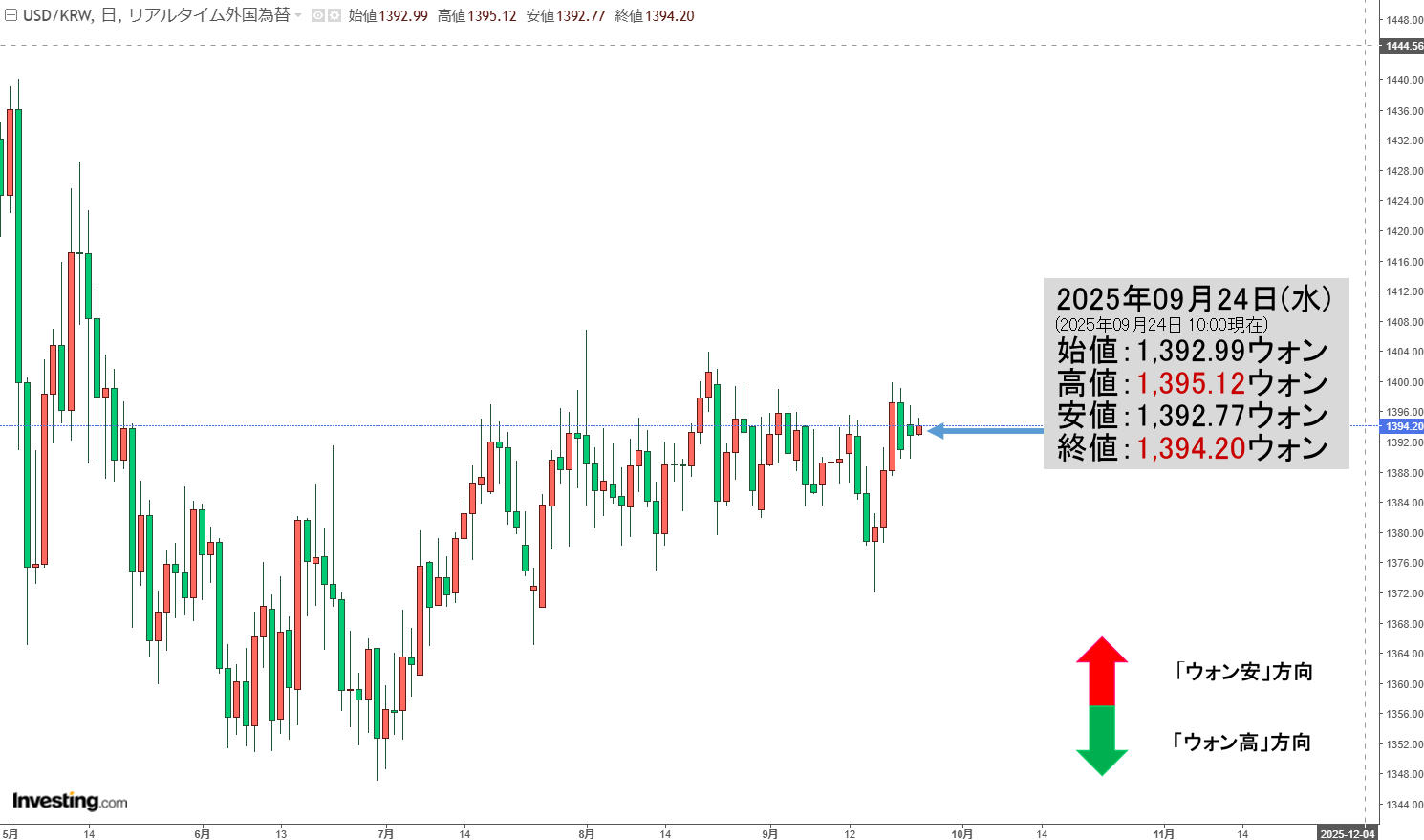 2025年09月24日(水)の市場が開きました。10:00現在、ドルウォンのチャートは以下のようになっています(チャートは『Investing.com』より引用)。