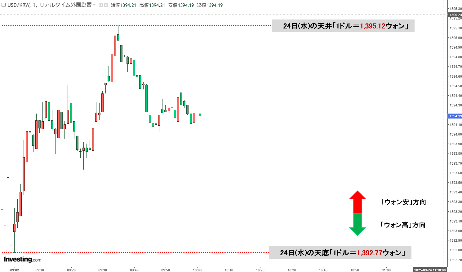 「ドルウォン」09月24日(水)初動・「1,394ウォン」小さく陽線。