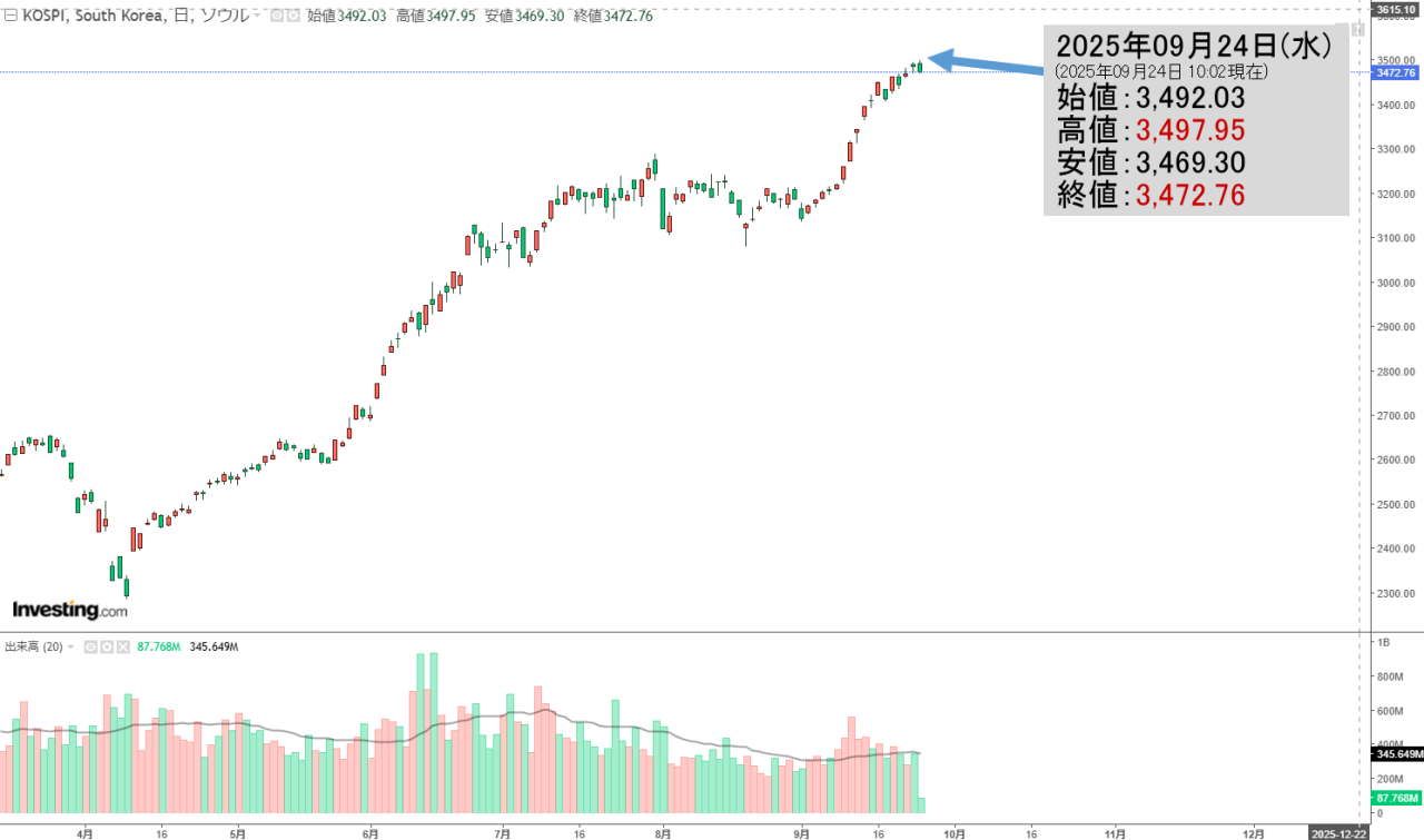 2025年09月24日(水)の韓国株式市場が締まりました。15:36現在、KOSPI(韓国総合株価指数)のチャートは以下のようになっています(チャートは『Investing.com』より引用)。陰線が伸びました。KOSPIは「3,472」ま...